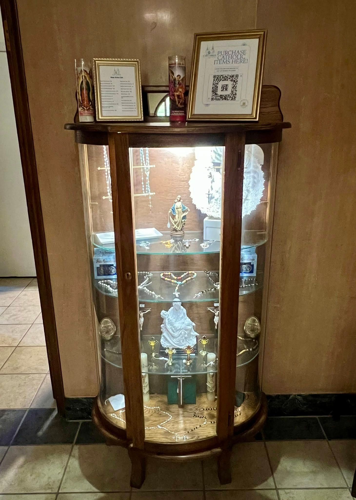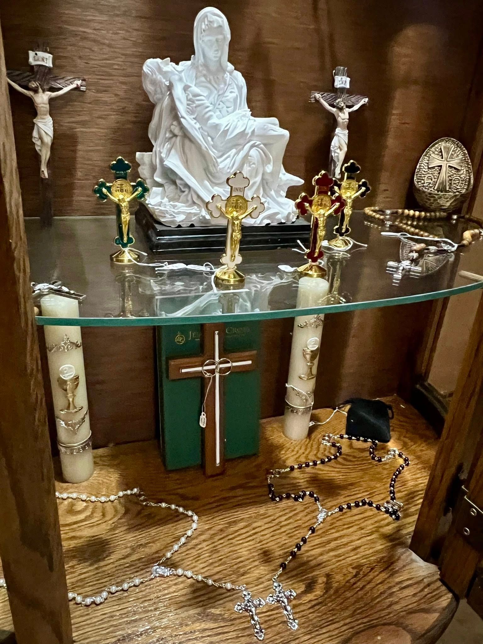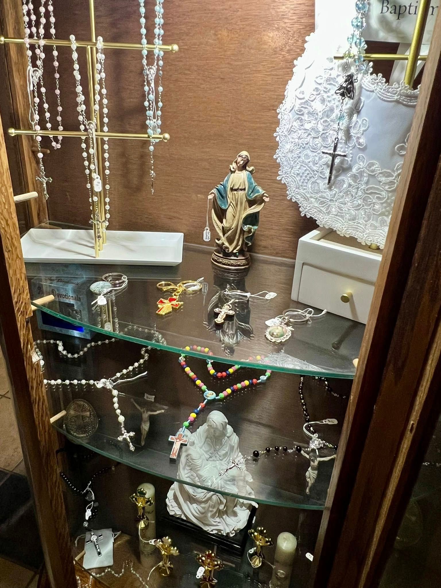We’ve added a Catholic devotional cabinet featuring a variety of items for purchase, including rosaries, keychains, crucifixes, and various sacramental items to support your prayer life and walk with Christ.