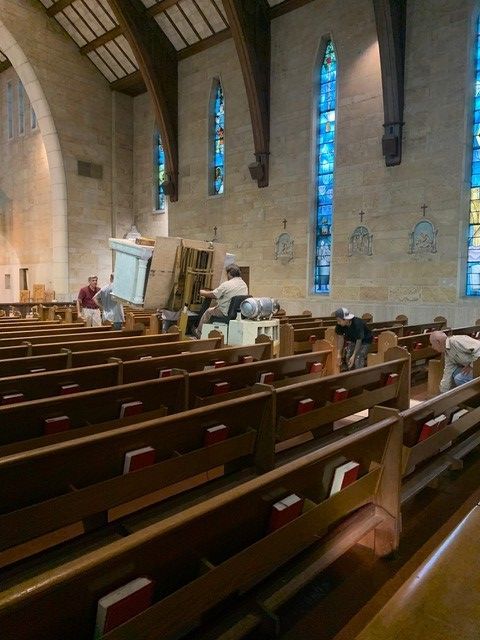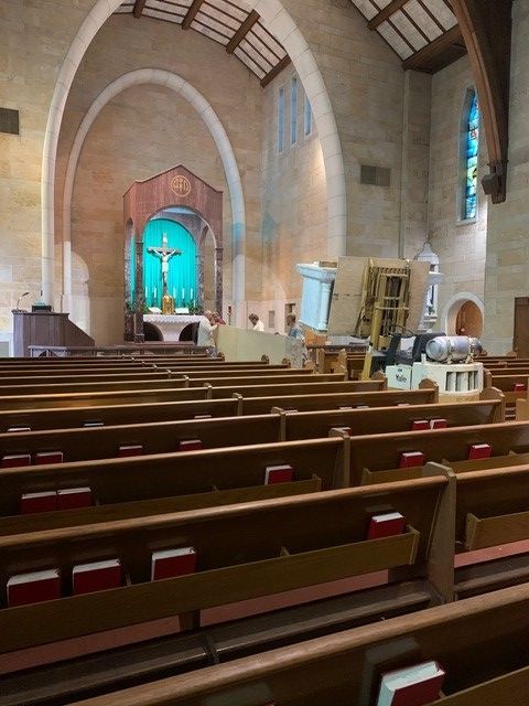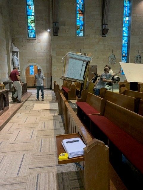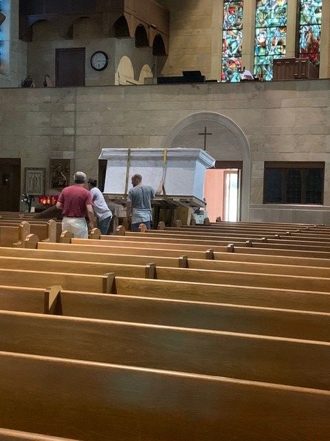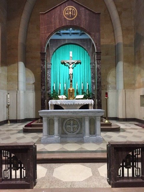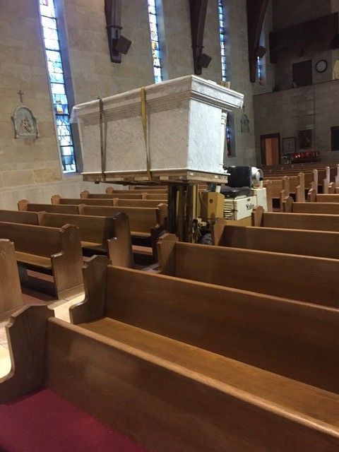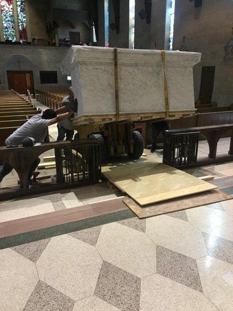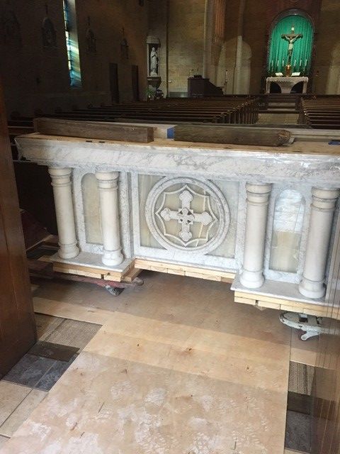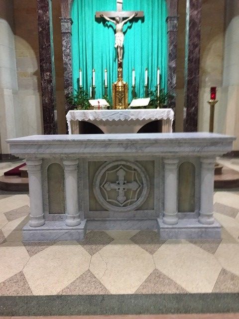 St. John's Catholic Church received a new marble alter in June 2021. The columns of the alter are imported Italian Calcutta marble while the backgrounds behind the columns are Italian Onyx.