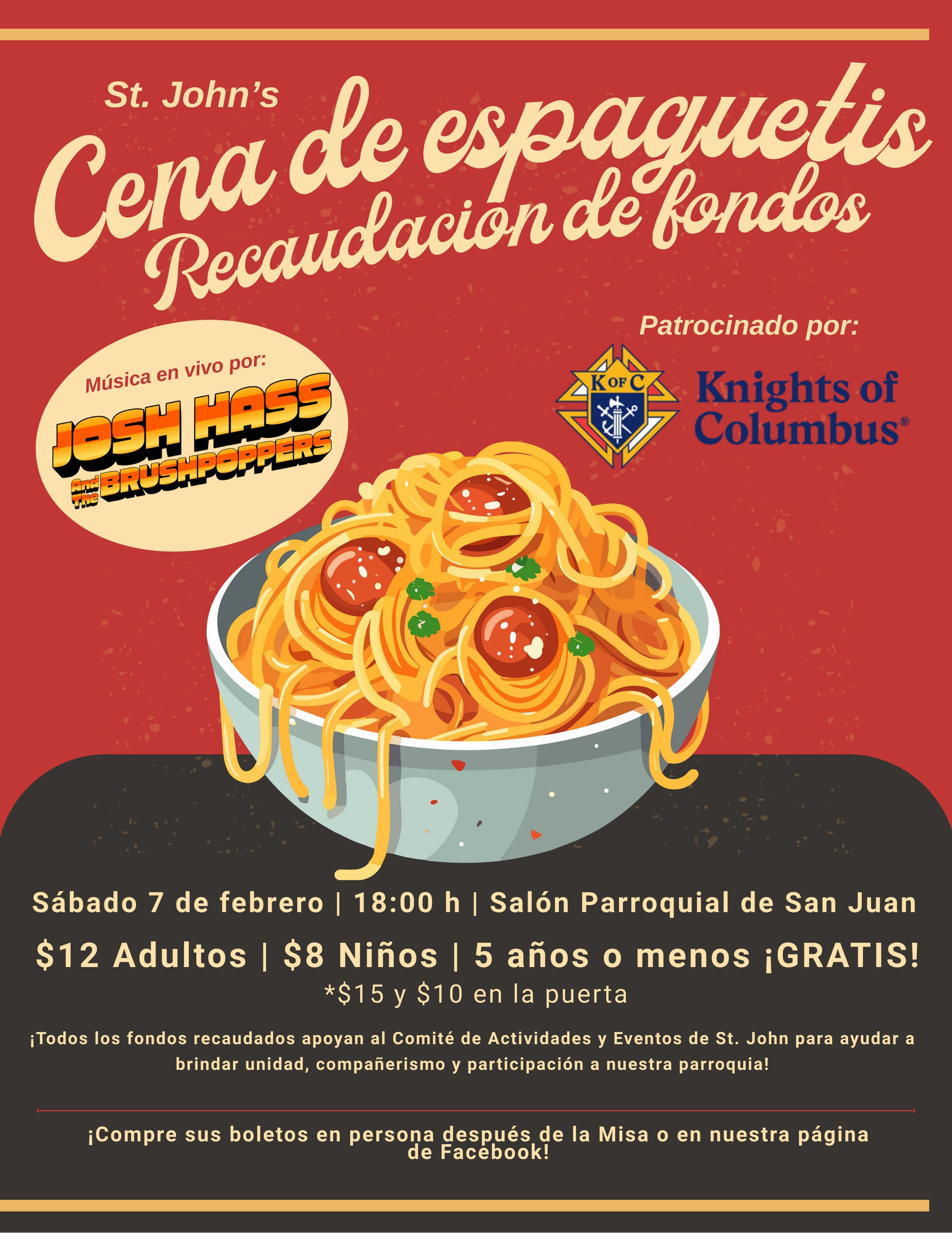 Join us and enjoy a spaghetti dinner and live music on Saturday, February 7th at 6pm in the parish hall! All funds raised support St. John's Activities & Events Committee to help bring unity, fellowship, and participation to our parish!